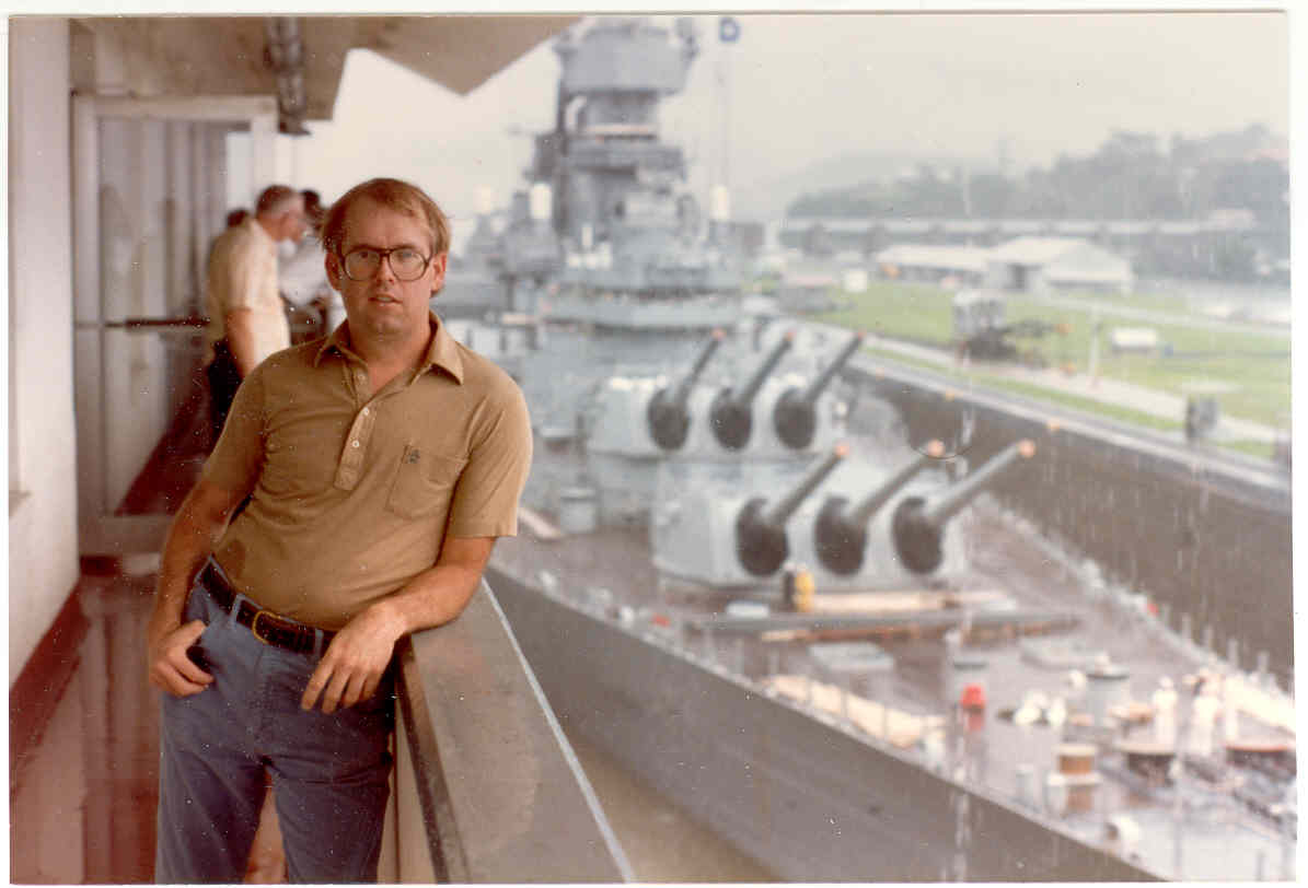 | Here is a photo of Jimmy lee Slover and the New Jersey at Miraflores Locks in the Canal Zone back when Jimmy Lee Slover was a Senior Control House Operator. The New Jersey is in the upper east chamber going south to the Pacific Ocean. Pictures are 1983. This is about the last time the New Jersey navigated the Panama Canal under her own power. |