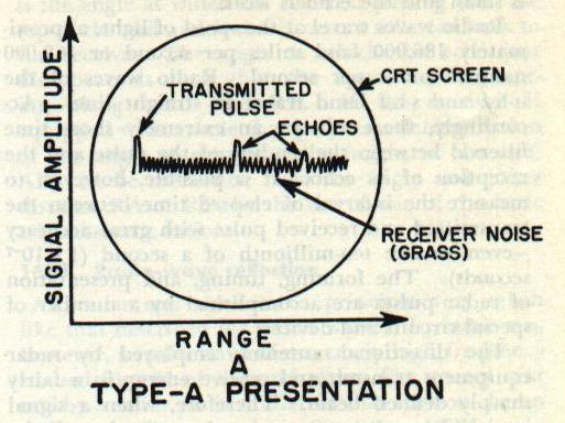 | B. Principles of Radar 16B1. Definition The word RADAR is formed as an abbreviation for Radio Detection And Ranging. It is an electronic device that may be used to detect the presence of objects like airplanes or ships even in darkness, fog, or storm. In addition to indicating their presence, radar may be used to determine their bearing, distance, elevation, and speed; and to enable the operator to recognize their general character. It is one of the greatest scientific developments that has emerged from World War II. Its development, like that of most great inventions, was mothered by necessity, that of detecting the enemy before he detected us. The basic principles upon which its functioning depends are relatively simple, and the seemingly complicated series of electrical events encountered in radar can be resolved into a logical series of functions which, taken individually, may be identified and understood. 16B2. Sound-wave reflection The principle upon which radar operates is very similar to the principles of sound echoes or wave reflection. If a person shouts in the direction of a cliff, or some other sound-reflecting surface, he hears his shout “return” from the direction of the cliff. What actually takes place is that the sound waves, generated by the shout, travel through the air until they strike the cliff. There they are reflected or “bounced off,” and some are returned to the originating spot, where the person is then able to hear the echo. Some time elapses between the instant the sound originates and the time when the echo is heard because sound waves travel through air at approximately 1,100 feet per second. The farther the person is from the cliff, the longer this time interval will be. If a person is 2,200 feet from the cliff when he shouts, about 4 seconds elapse before he hears the echo, that is, 2 seconds for the sound waves to reach the cliff and 2 seconds for them to return. |
