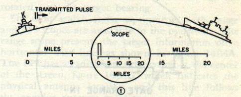 | 16B6. Types of presentation To furnish usable intelligence, a radar set must have some type of visual presentation of the target echo for the operator to observe. Cathode-ray tubes are used for this purpose. The cathode-ray tube is a special type of vacuum tube which acts as an electronic stop watch. As shown in figure 16B3, electrons are channeled into a narrow beam by an electron gun in the neck of the tube. The electrons shoot out of the small hole at the right-hand end of the gun and hit the fluorescent screen on the large end of the tube, which glows at the point where the electrons strike. Between the gun and the screen, the electron beam passes between vertical deflection plates and horizontal deflection plates. If a variable voltage Is applied to the horizontal plates, the beam can be made to sweep back and forth in a horizontal line. If a voltage is applied to the vertical plates, the beam can be made to deflect in a vertical direction. If a voltage to the vertical plates is used in conjunction with the voltage to the horizontal plates, a horizontal line deflected upward at certain points can be produced. Type-A presentation is used to determine range, and the scope has short persistence (a target indication remains on the scope face only instantaneously). The echo causes a vertical displacement of the spot. The amplitude of the displacement depends on the strength of the returned signal pulse. The point on the horizontal base line at which the vertical displacement occurs indicates the range. Type-A presentation is shown in figure 16B4A. The Type-B presentation (fig. 16B4B) indicates both range and azimuth angle. The vertical displacement of the echo signal indicates range, and the horizontal displacement of the echo signal indicates azimuth angle. This scope has medium to long persistence. Type PPI (plan position indicator) presentation, shown in figure I6B4C, also indicates range and azimuth angle. In this type of presentation the electron beam is swept radially from the center of the scope to the outer edge. The sweep line follows the antenna rotation. In effect, a picture of surrounding objects is painted” on the screen. This scope has medium persistence. 16B7. Range determination The successful employment of pulse-modulated radar systems depends primarily on the ability to measure distance in terms of time and on a knowledge of the velocity of light. Radio-frequency energy, once it has been radiated into space, continues to travel with a constant velocity. When it strikes a reflecting object there is no loss of time, but merely a redirecting of a portion of the energy. Its velocity at the speed of light is 328 yards per microsecond. This means that it takes approximately 6.1 microseconds of radio energy to travel one nautical mile which is approximately 2,000 yards. All radar ranging is based on a flat figure of 2,000 yards per mile, and, because the speed of light (and radio waves) is so great, microseconds (ps) are used for all time determinations. This constant velocity of r-f energy is applied in radar to determine range by measuring the time required for a pulse to travel to a target and back. The time lapse between the transmitted pulse and the echo return may be readily determined with the aid of the scope. For the purpose of illustrating how this is done, assume that a target ship is 20 nautical miles away from the radar set. Because radio energy travels 1 nautical mile in 6.1 microseconds, 122 microseconds will be required for the transmitted pulse to reach the target, or a total of 244 microseconds will elapse before the echo will return to the radar receiver. To measure this time, the horizontal sweep frequency of the scope is adjusted so that it makes one complete sweep (from left to right) during the time the transmitted pulse is going to the target and the echo is returning to the receiver. Figure l6B5 shows how the range is then determined. In 16B5-1 the transmitted pulse is just leaving the antenna. A part of the generated energy is fed to the vertical deflection section of the scope tube at the instant the pulse is transmitted and causes a vertical line (pip) to appear at the zero-mile mark on the scope. In 16B5-2, 61 microseconds later, the transmitted pulse has traveled 10 miles toward the target. The horizontal trace on the scope, however, has reached only the 5-mile mark, that is, one half the distance the transmitted pulse has traveled. In figure 16B5-3, 122 microseconds after start, the transmitted pulse has reached the target 20 miles away and the echo has started back. Scope now reads 10 miles. In figure 16B5-4, 183 microseconds after start of initial pulse, the echo has returned half the distance from the target, and the scope reading is 15 miles. In 16B5-5, 244 microseconds after the initial pulse, the echo has returned to the receiver. An echo pip, of smaller amplitude than the initial transmitter pip, is displayed on the scope at the 20-mile mark. If two or more targets are in the path of the transmitted pulse, each will return a portion of the incident energy as echoes. The target farthest away (assuming they are similar in size and type of material) will return the weaker echo. The foregoing are the basic principles of all ranging scope determinations. Usually in conjunction with the scope there is a hand crank and mechanical counter assembly. When a target is indicated on the base line, the operator turns the hand crank to move the range indicator, or gate (fig. 16B6), to the target and then reads the range, in yards, directly from the counter assembly. This is called “gating the target.” 16B8. Bearing determination The bearing (true or relative) of the target may be determined if the direction in which the directional antenna is pointing when the target is picked up is known. Control and indicator systems have been devised that make this possible. The measurement of the bearing of a target as “seen” by the radar is usually given