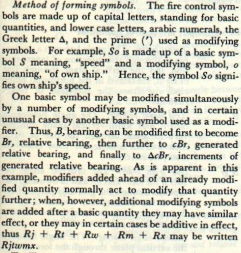 Fl. General Symbols are used in fire control to provide a brief, accurate means of representing quantities which would otherwise require extended definition. The standard system of fire control symbols approved by the Bureau of Ordnance is applicable to the surface and antiaircraft problems and, with certain exceptions, to the torpedo fire control problem and the antisubmarine fire control problem. Standard symbols used in the torpedo fire control problem are listed in chapter 27. Method of forming symbols. The fire control symbols are made up of capital letters, standing for basic quantities, and lower case letters, arabic numerals, the Greek letter (triangle), and the prime (’) used as modifying symbols. For example, So is made up of a basic symbol S meaning, “speed” and a modifying symbol, o meaning, “of own ship.” Hence, the symbol So signifies own ship’s speed. One basic symbol may be modified simultaneously by a number of modifying symbols, and in certain unusual cases by another basic symbol used as a modifier. Thus, B, bearing, can be modified first to become Br, relative bearing, then further to cBr, generated relative bearing, and finally to (triangle)cBr, increments of generated relative bearing. As is apparent in this example, modifiers added ahead of an already modified quantity normally act to modify that quantity further; when, however, additional modifying symbols are added after a basic quantity they may have similar effect, or they may in certain cases be additive in effect, thus Rj + Rt + Rw + Rm + Rx may be written Rjtwmx. To illustrate the use of the prime, B is the basic symbol for bearing. Unmodified, it means true bearing, measured from a vertical plane through the north-south axis to a vertical plane through the line of sight to the target, in the horizontal plane clockwise from north. (Note that to define an angle completely, it is necessary to indicate (1) from what plane it is measured, (2) to what plane it is measured, and (3) in what plane it is measured.) Br, relative target bearing, is measured from a vertical plane through the fore-and-aft axis of own ship from the bow of own ship to a vertical plane through the line of sight, in the horizontal plane clockwise from the bow of own ship. Since guns and directors are fastened to the deck of the ship, they can measure Br only at that instant when the deck is horizontal. Consequently, actual values of director train (an angle measured in the deck plane is called, in fire control language, train not bearing) include a prime (’) signifying that the quantity is measured with respect to the standard reference plane of the ship, or deck plane. B’r, director train, is the quantity actually used in some dual-purpose fire control systems, and is the angle measured from the vertical plane through the fore-and-aft axis of own ship to the vertical plane through the line of sight, in the deck plane clockwise from the bow of own ship. This measurement is possible only in systems which have stabilization of the director optics, so that the cross-wires of the telescopes are maintained in the vertical and horizontal. If this is not the case, director train is measured with respect to director sights which elevate in a plane perpendicular to the deck, and the symbol is B’r’, the first prime indicating “in the deck plane,” the second prime indicating “perpendicular to the deck plane.” In the same way, E is elevation measured in a vertical plane and E’ is elevation measured in a plane perpendicular to the deck. |